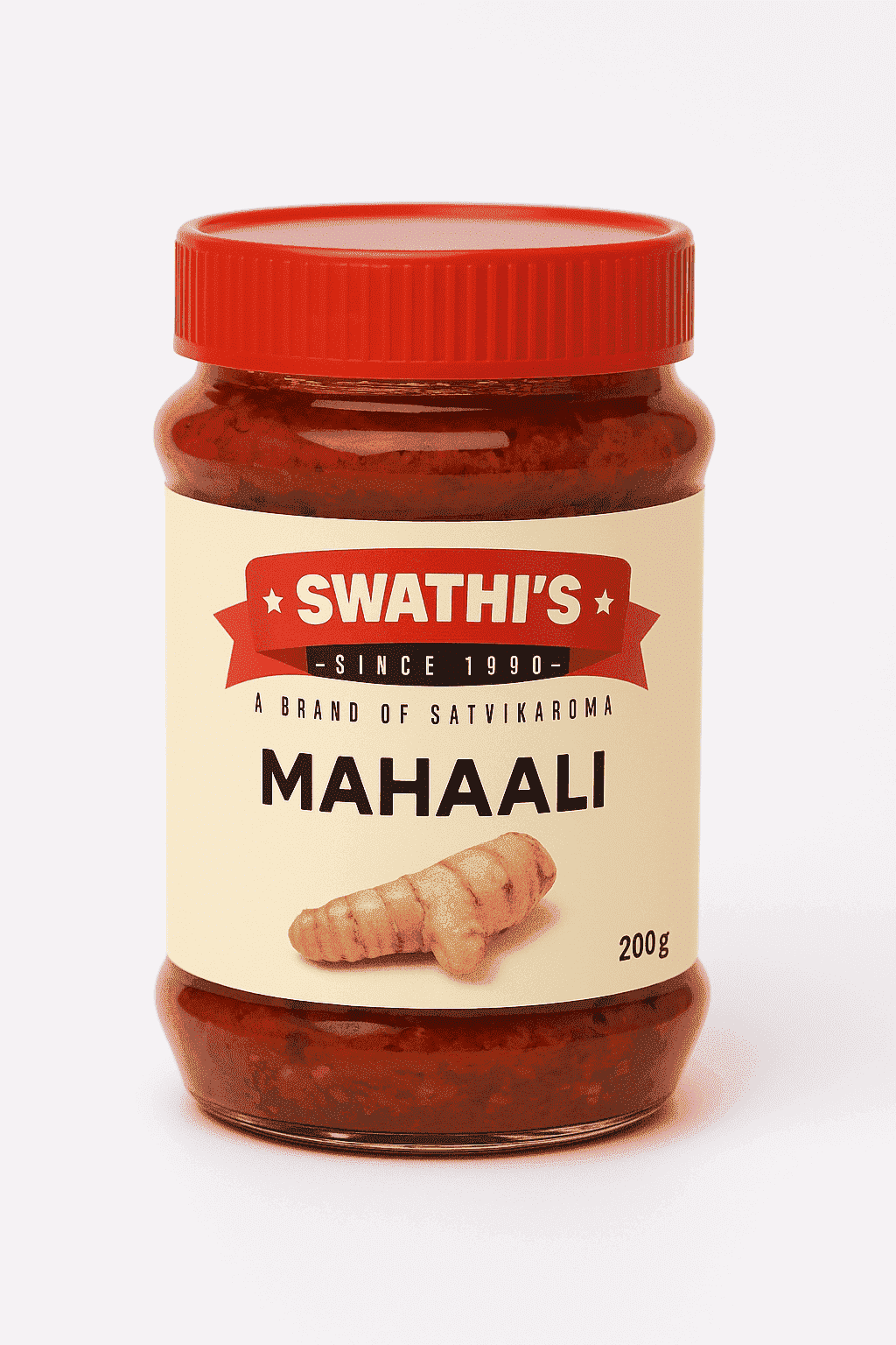 SWATHI’S™ Mahaali Thokku brings back the powerful essence of ancient Tamil kitchens. Made from Mahaali Kizhangu (Indian sarsaparilla root), this thokku is valued for its strong aroma, therapeutic qualities, and rare flavor.